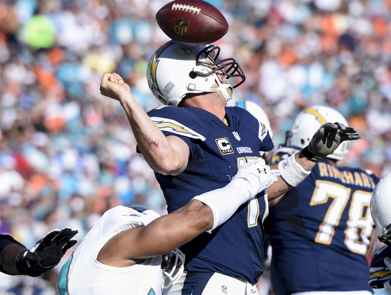 San Diego Chargers quarterback Philip Rivers appeared to have the ball glued to his helmet as he was hit during a lopsided loss to the Miami Dolphins.