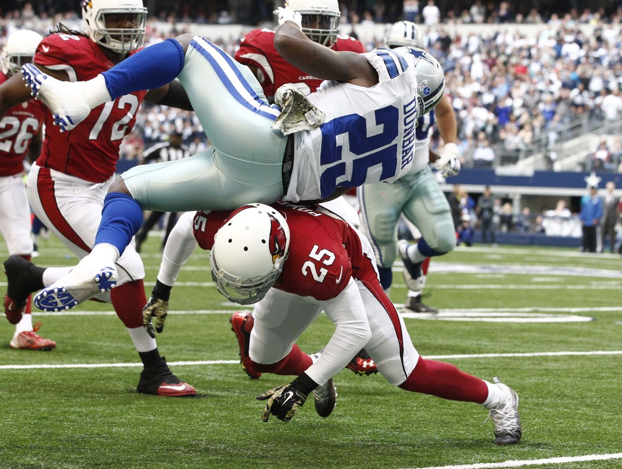 Dallas Cowboys running back Lance Dunbar was the victim of a Scott Stevens-esque hip check by the Arizona Cardinals' Jerraud Powers.