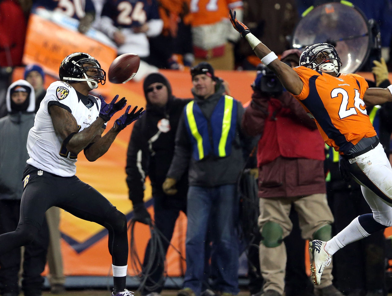 With 40 seconds left in the game, Joe Flacco connected on a 70-yard Hail Mary touchdown pass to Jacoby Jones that took the game to overtime after safety Rahim Moore famously misplayed the ball.