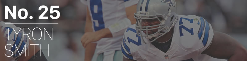 Smith's leverage, lateral quickness, and speed are nearly unmatched by any left tackle in the NFL, and he kept the Cowboys' offense alive with prolonged absences from Tony Romo and Dez Bryant. Smith emerged as the league's best run-blocking left tackle, and was integral to Darren McFadden nearly cracking the 1,100-yard mark. - Srinivasan