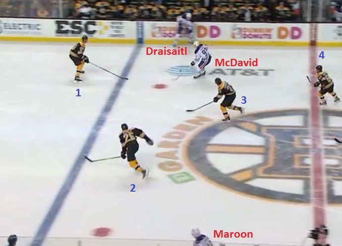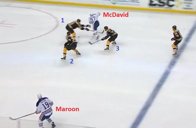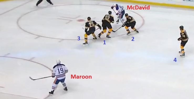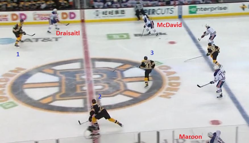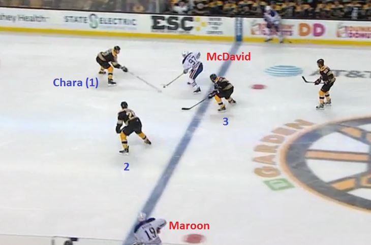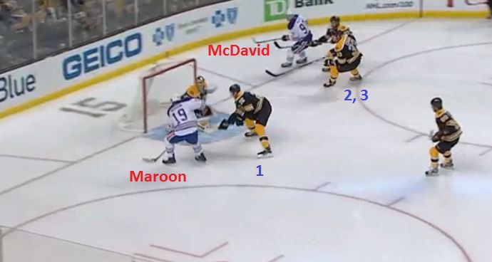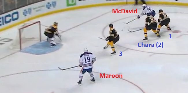 Draisaitl's pass means McDavid enters the Boston zone on what is now a two-on-three rush, with Maroon way over on the far wing, hardly in position to provide much help. Keep in mind, one of the three Bruins below - the one right in front of McDavid - is Zdeno Chara, who is the size of two normal humans and uses a stick as long as a small tree: