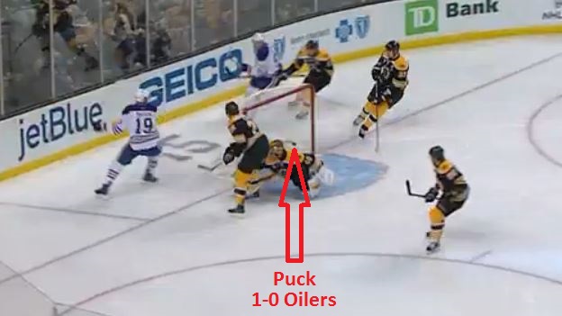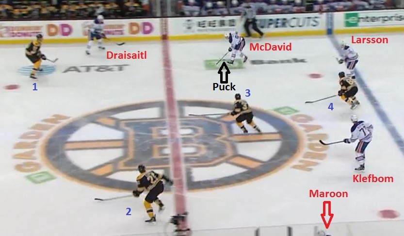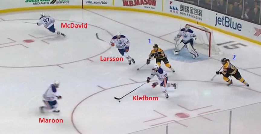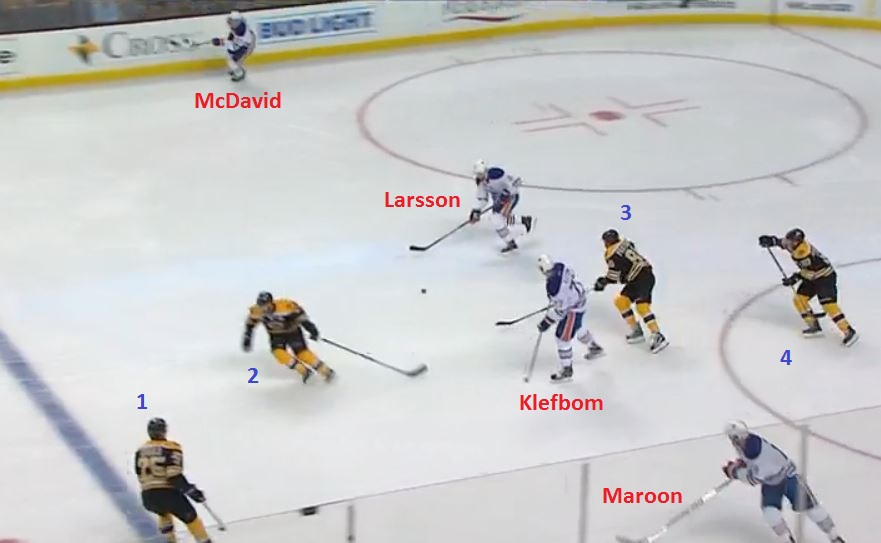 The play begins with Edmonton defenseman Oscar Klefbom blocking a weak wrist shot from the point and leading the breakout, with two Bruins trapped behind him. Here come the Oilers: