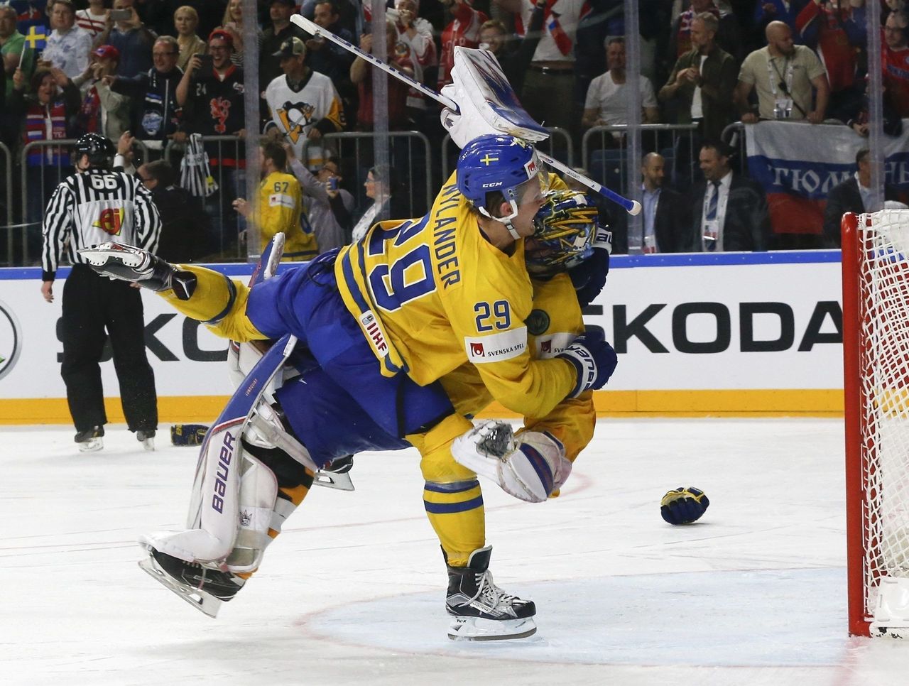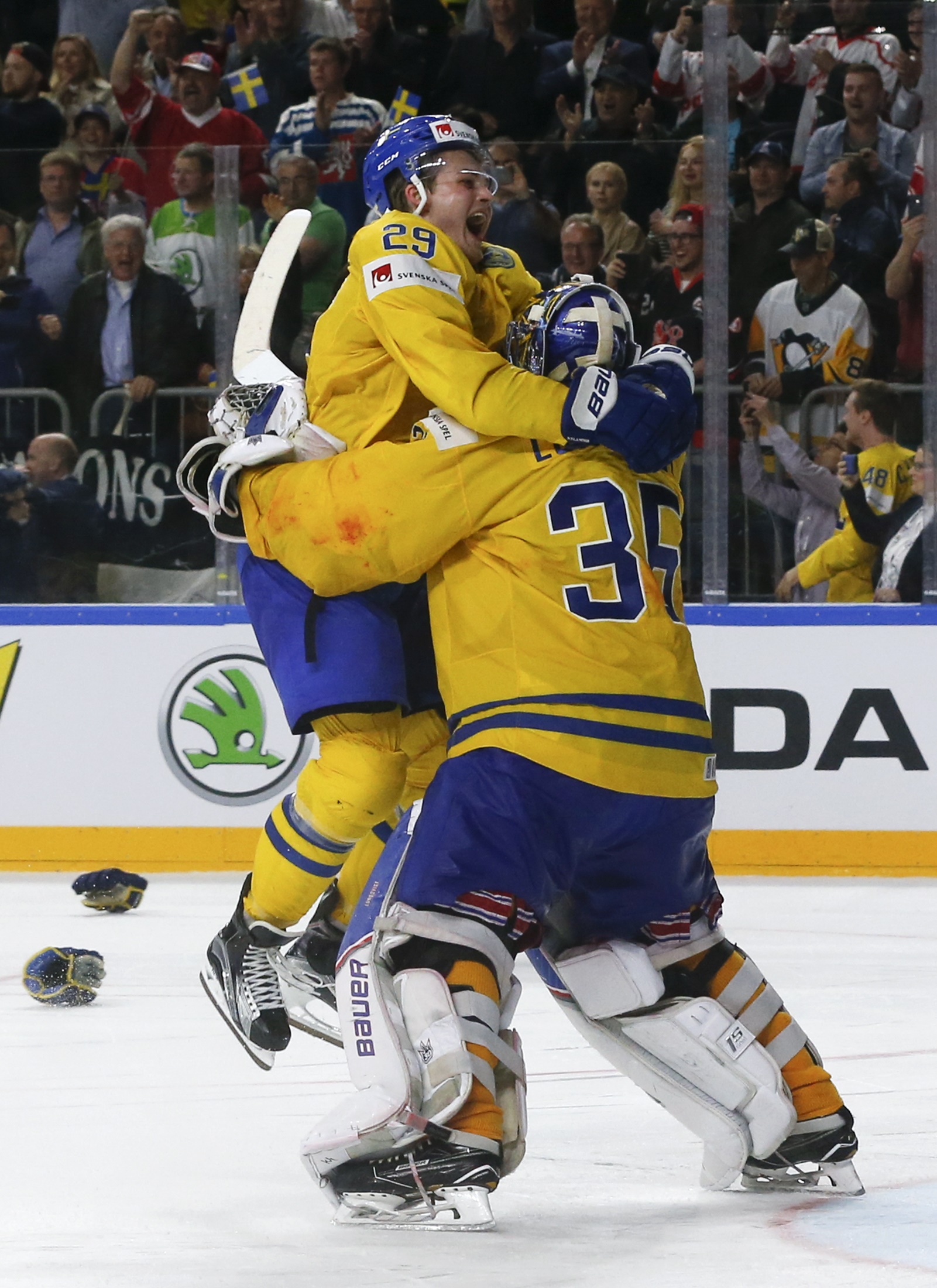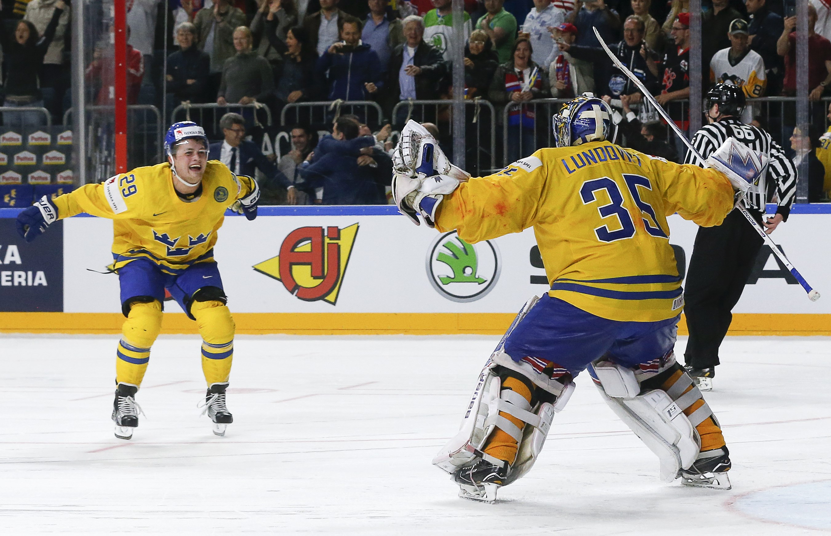 Henrik Lundqvist makes the game-winning save for Team Sweden, gets tackled by William Nylander #IIHFWorlds pic.twitter.com/jgFagRlKOU