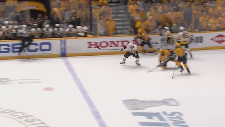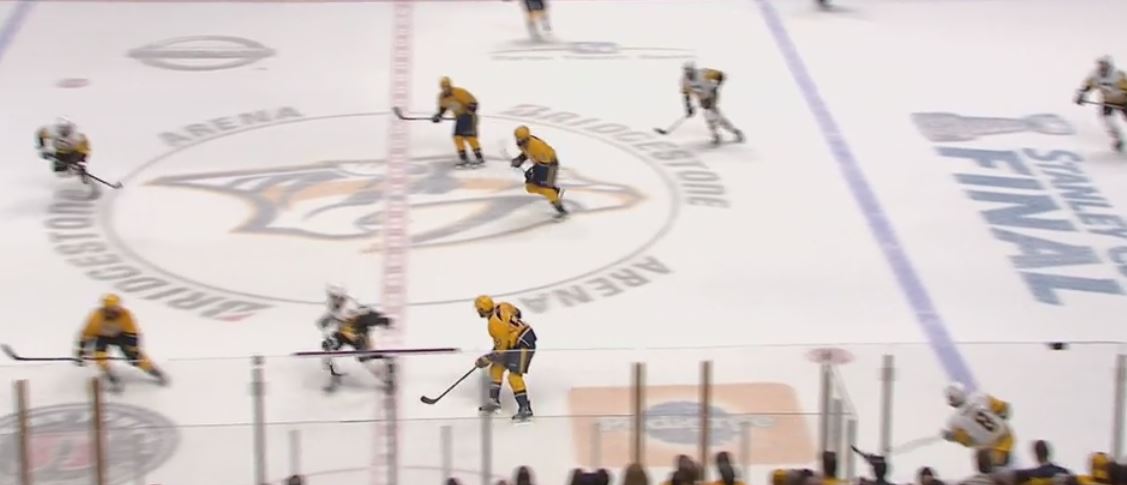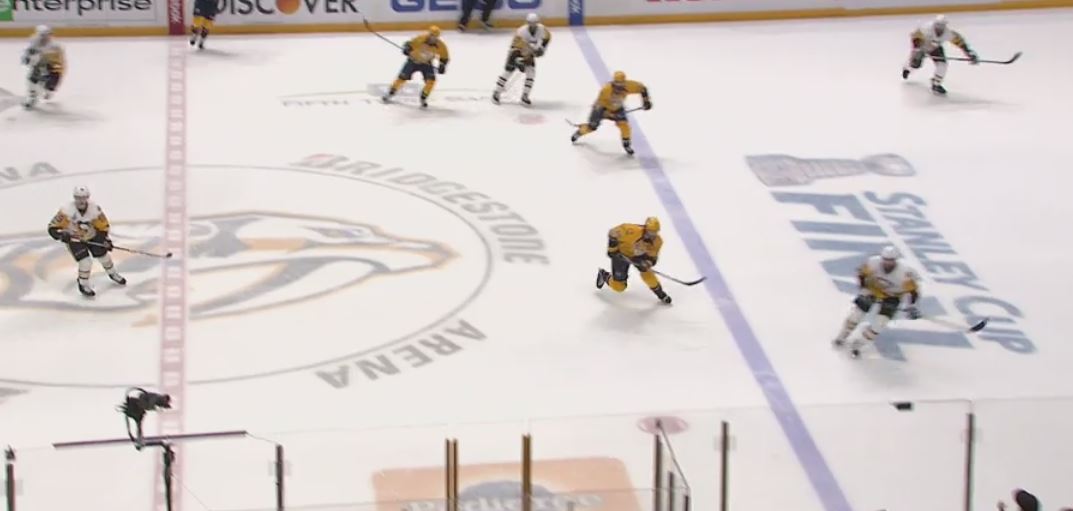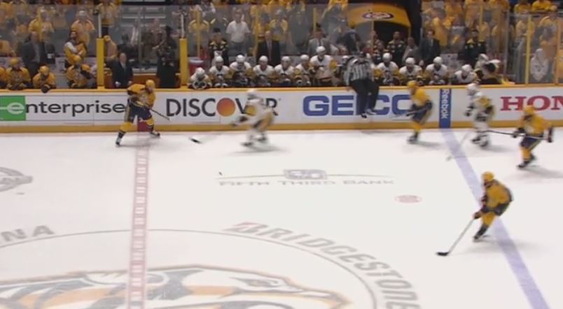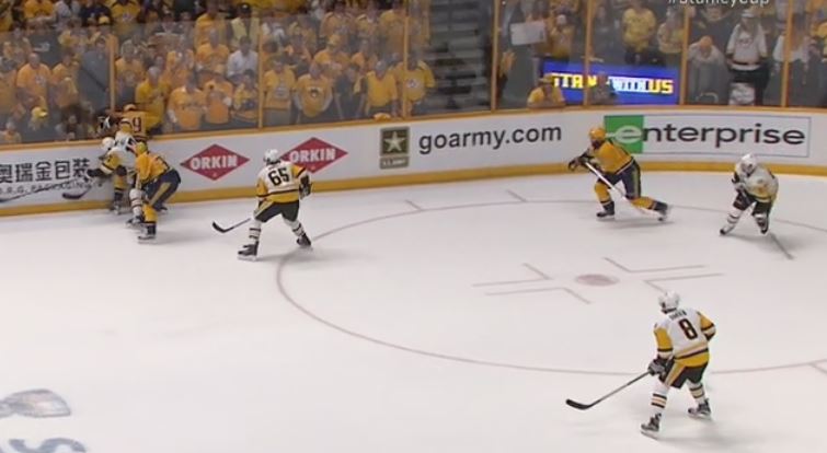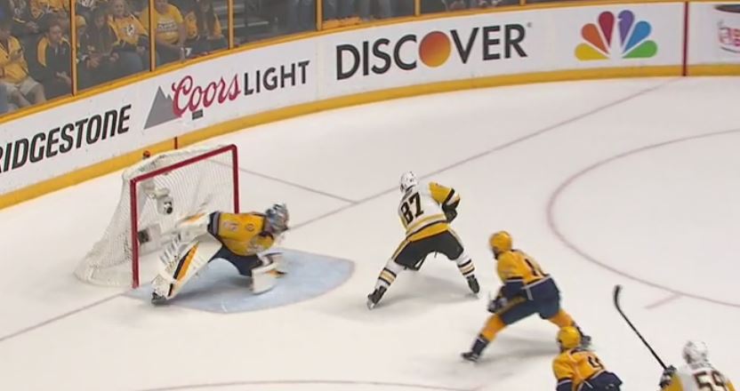 With Nashville's defense stuck after pinching to keep the puck in Pittsburgh's zone, the responsibility of tracking the puck fell to James Neal (No. 18), who immediately sent it across the ice while pressured by an attacking Crosby.