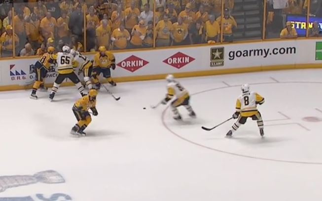 The pass was not received by a Predator, but instead by Penguins defenseman Brian Dumoulin (No. 8), who no doubt had eyes on Crosby (top left), who has skated over center after failing to strip Neal of the puck.