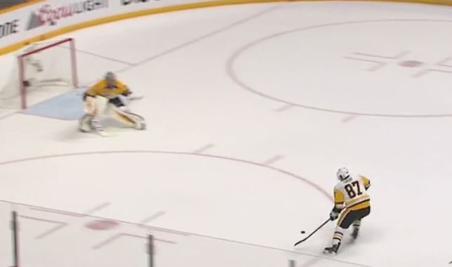 Crosby broke in all alone on Pekka Rinne (No. 35), and dropped a devastating backhand move before anyone could catch up.