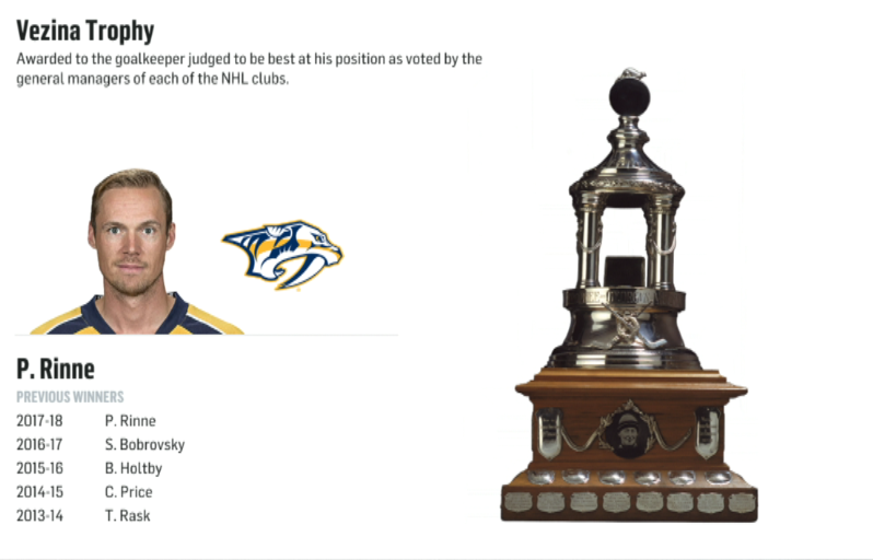 - Rinne had a season to remember, posting a record of 49-22-4 to go with 10 shutouts. The 34-year-old also led the league in save percentage (.933) and goals-against average (1.96).