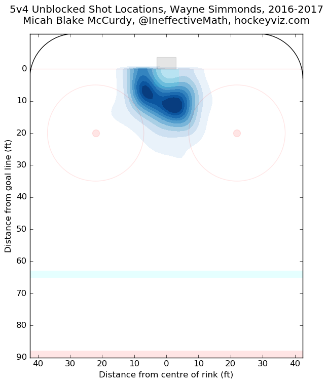 Two of Simmonds' goals were scored with the man advantage, both coming off deflections from his office just outside the crease. Last season, Simmonds totaled 16 power-play tallies, the second-highest total in the NHL. Looking at the data, it's easy to identify where he does his damage.