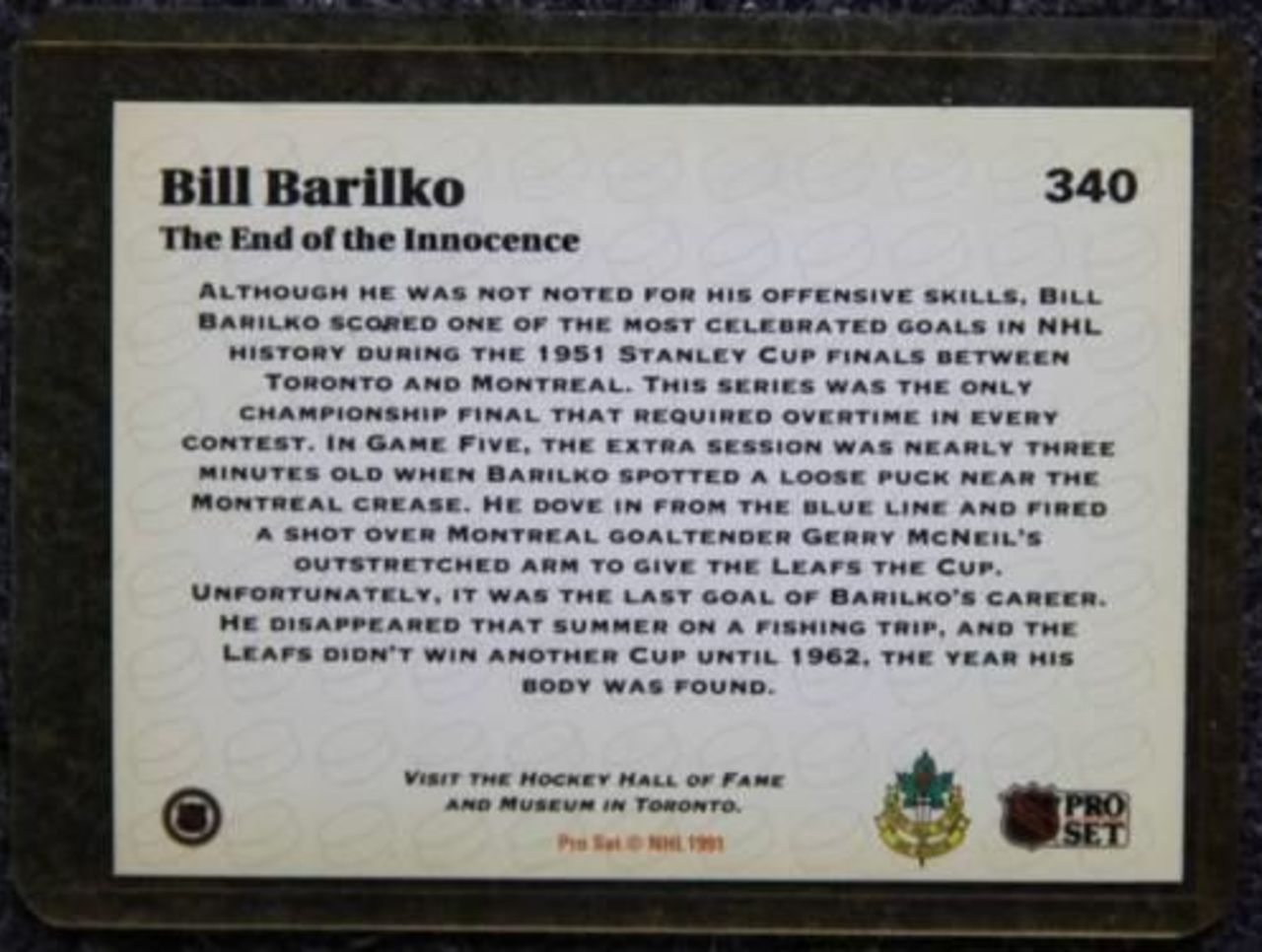 The Tragically Hip pay tribute to Barilko in their hit song "Fifty Mission Cap," which tells the story of his mysterious disappearance after scoring the Stanley Cup-winning goal for the Toronto Maple Leafs in 1951.
