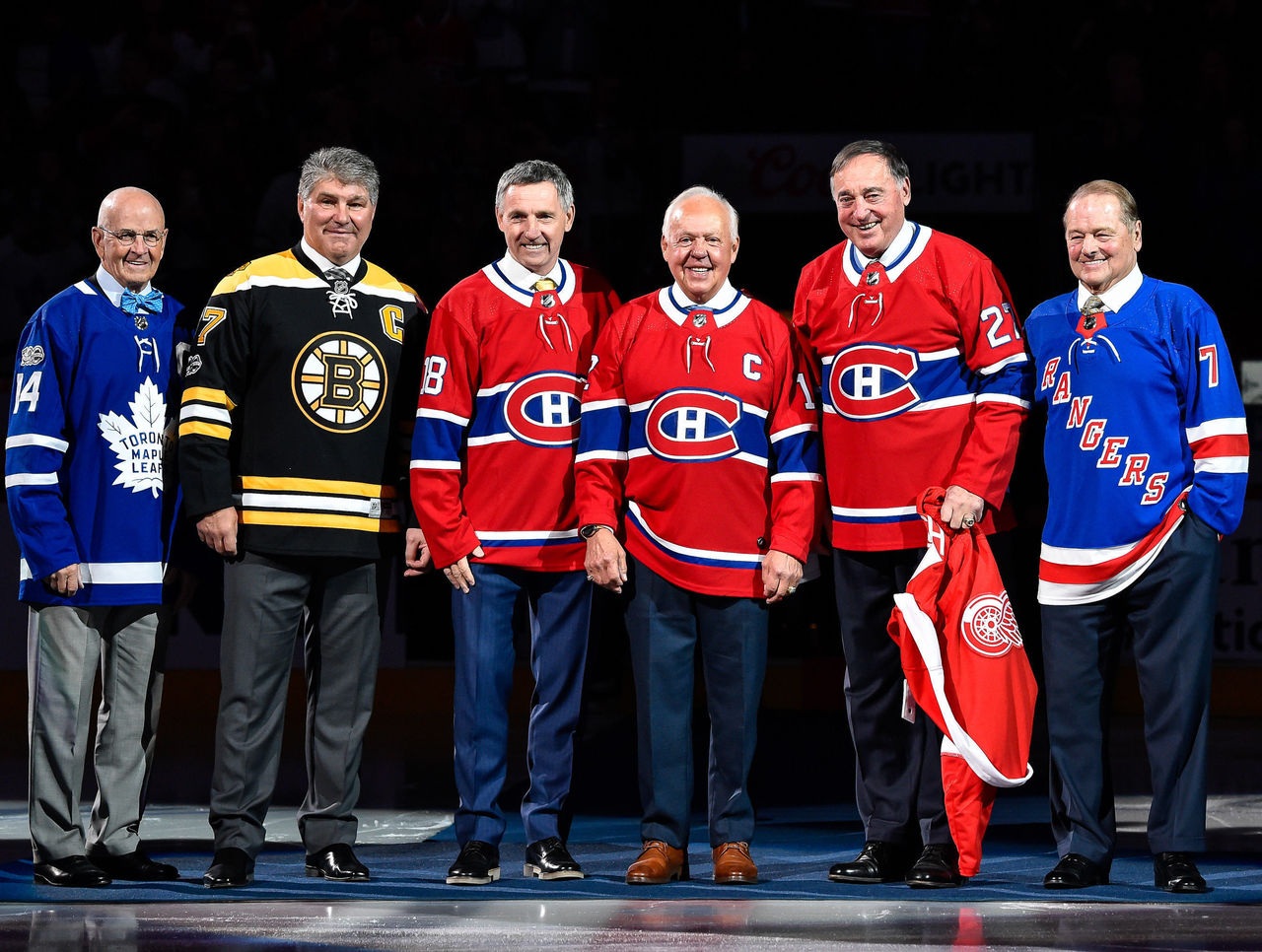 Prior to puck drop in Montreal, the NHL honored its Original Six franchises by having (from left to right) Dave Keon, Ray Bourque, Denis Savard, Yvan Cournoyer, Frank Mahovlich, and Rod Gilbert participate in a ceremonial puck drop.