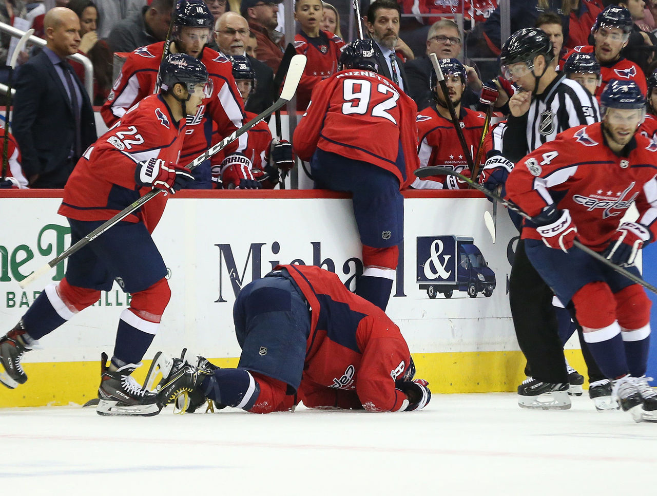 A scary scene unfolded in Washington as Capitals franchise winger Alex Ovechkin crumpled to the ice after taking a puck to the face.
