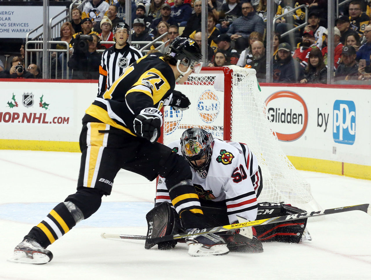 Malkin was penalized for goalie interference. Crawford quickly returned to the crease after being checked by team doctors in the locker room.