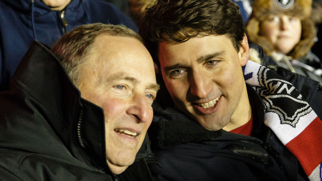 Prime Minister Justin Trudeau and NHL commissioner Gary Bettman converse while taking in the action.