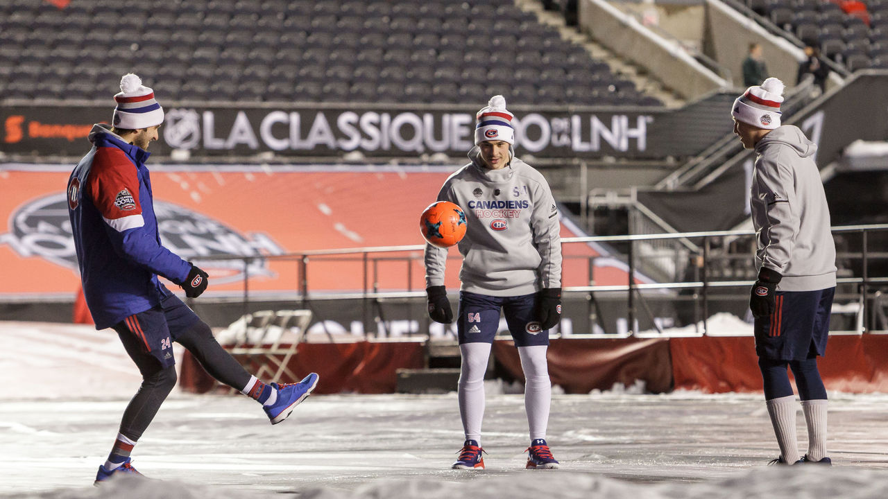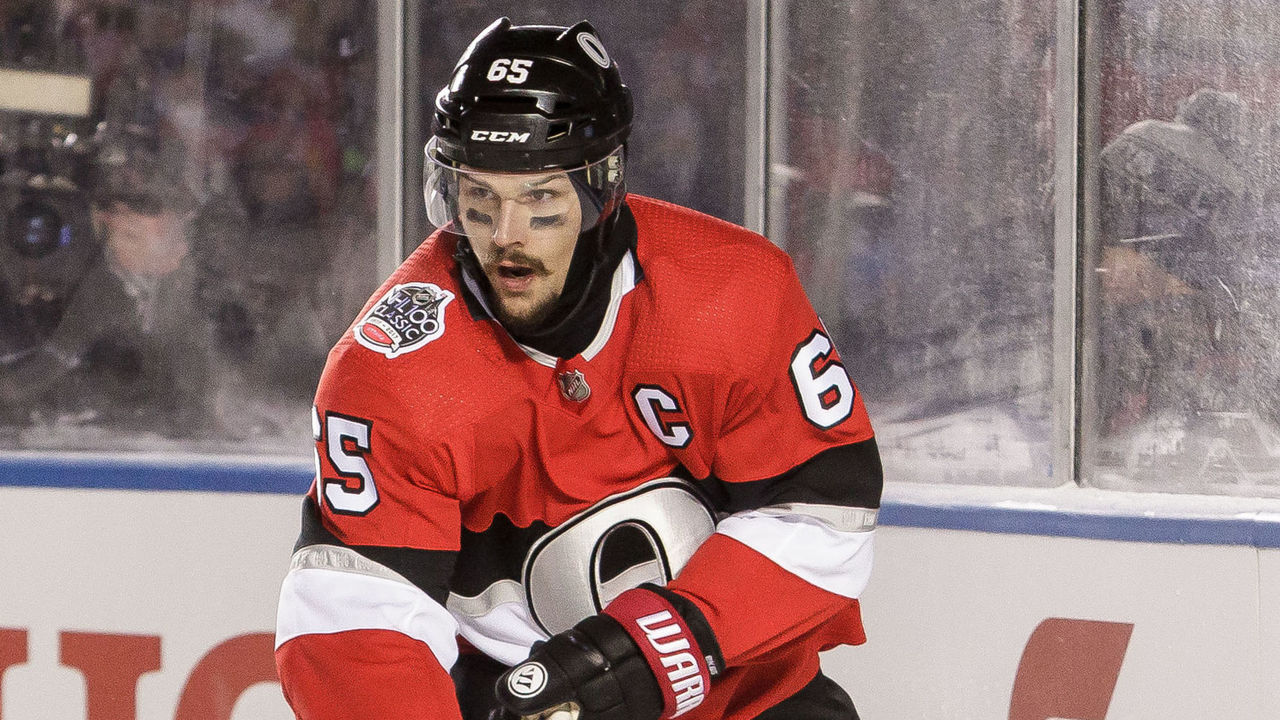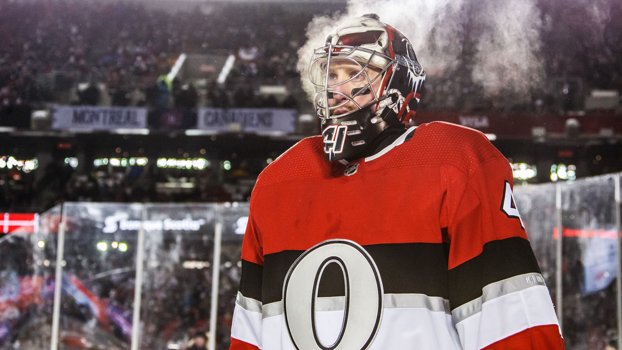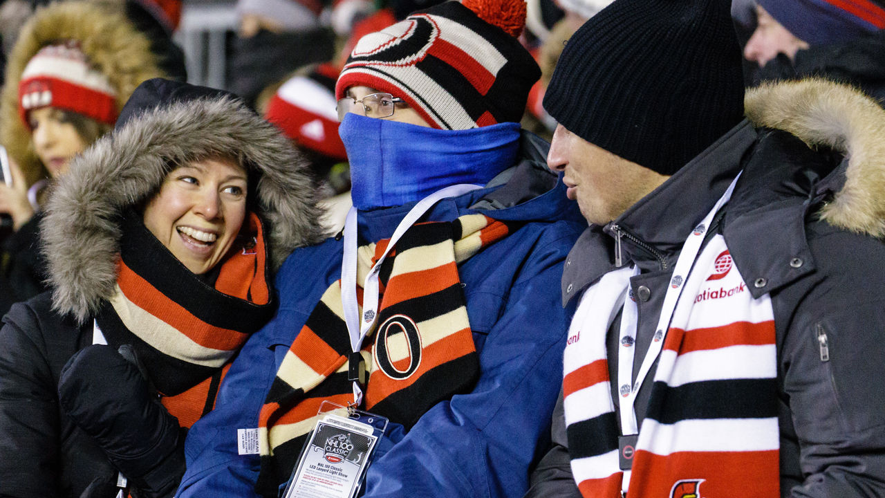 The players came prepared in head-to-toe winter gear, shown off here by Erik Karlsson.
