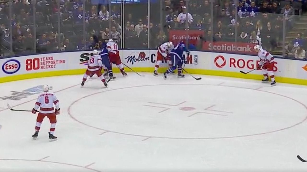 Warren Foegele (No. 13 in white) then scoops up the loose puck, evades a check from Matthews, and finds an open teammate. That teammate finds another teammate, and suddenly Carolina is attacking.