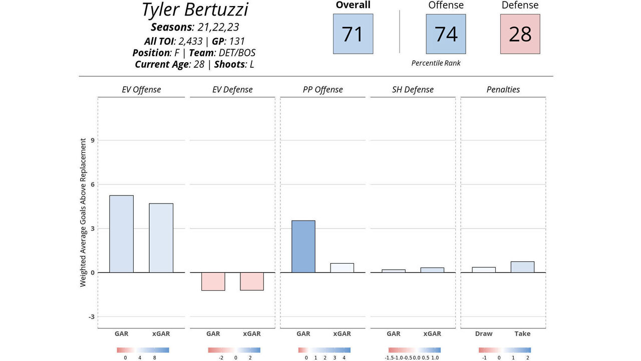 The 28-year-old enjoyed a career year in 2021-22 when he racked up 30 goals and 32 assists in 68 games with the Red Wings. His underlying numbers over the last three campaigns are strong offensively but poor defensively.