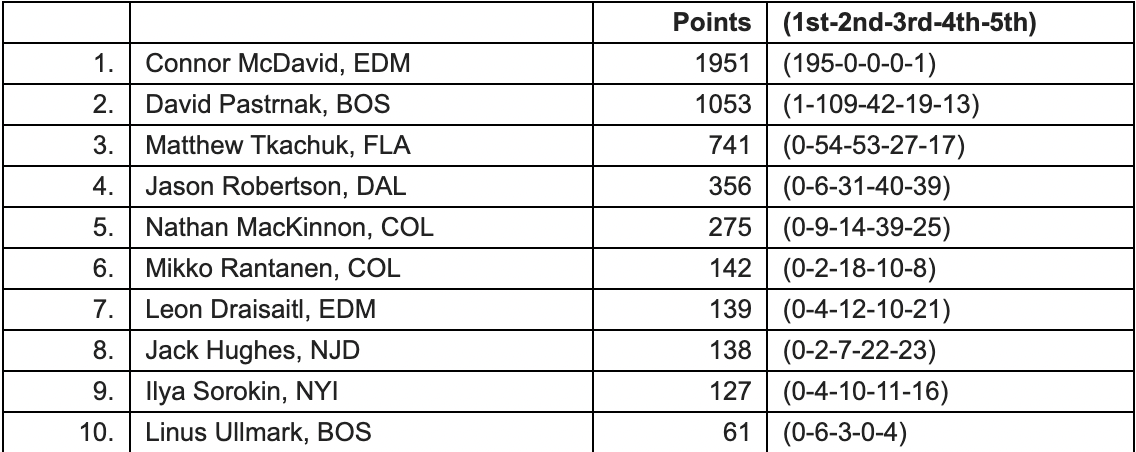 McDavid's exploits led Edmonton to 109 points, good for second in the Western Conference and the franchise's highest total since 1985-86. Playoff totals aren't factored into MVP voting, but McDavid carried his dominance into the spring with 20 points in 12 postseason games before the Oilers were eliminated in Round 2.