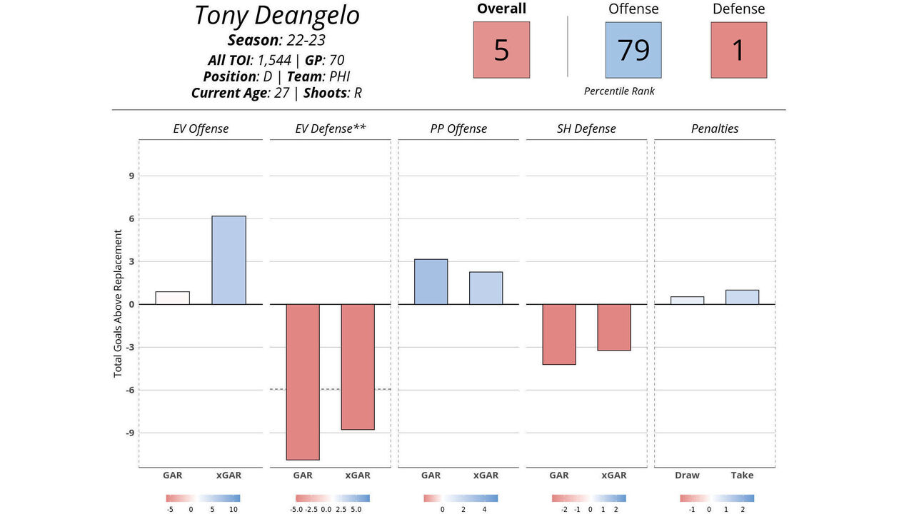 DeAngelo produced a respectable 42 points in 70 games with the Flyers, but his minus-15.1 defensive goals above replacement was the worst among all NHL skaters.