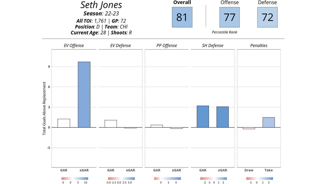 He led all Blackhawks skaters in average time on ice (24:27) last season and finished fourth on the club with 37 points in 72 games. His underlying numbers were strong, too, despite his minus-38 rating.