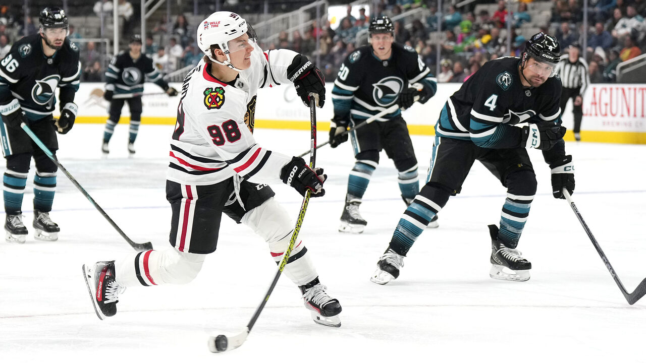 Dylan Guenther curls deep in the Utah Hockey Club's zone. He weaves through neutral ice then strategically gears down near the Blackhawks' blue line.