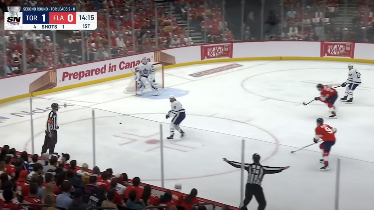 In the above screenshot, Toronto's Chris Tanev is scanning while also closing in on the puck. Partner Jake McCabe is calling for a behind-the-net pass. The retrieval is then executed to perfection. Tanev backhands the puck to McCabe as the forechecker drills him into the end boards. McCabe moves it north, and six seconds later the Maple Leafs score off the rush against the Panthers.