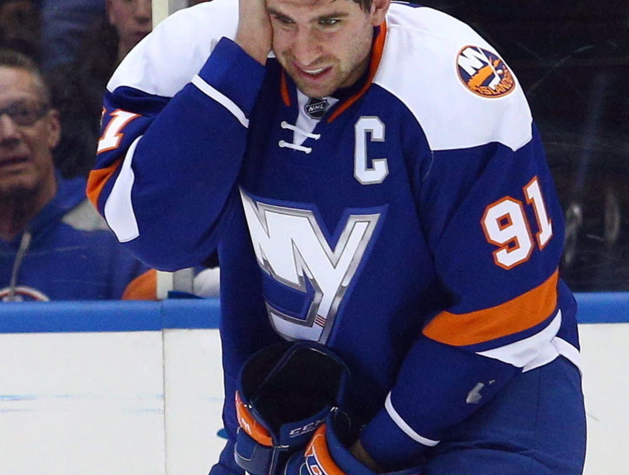 New York Islanders captain John Tavares grabs his ear and winces in pain after being struck by a shot off the stick of Tampa Bay Lightning defenseman Radko Gudas with less than two minutes remaining.
