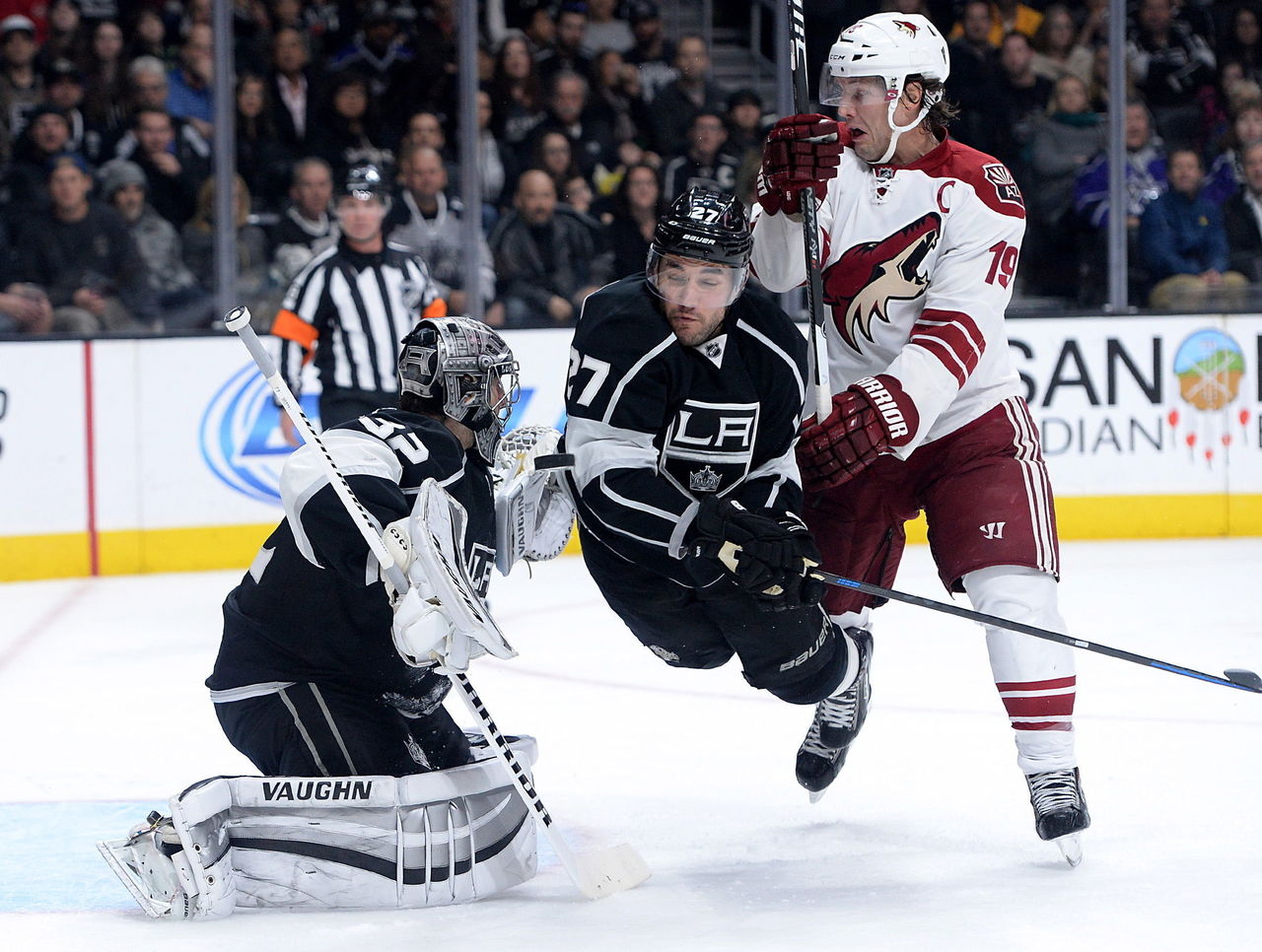 Los Angeles Kings defenseman Alec Martinez takes flight after being hit by Arizona Coyotes forward Shane Doan in front of Kings goaltender Jonathan Quick.