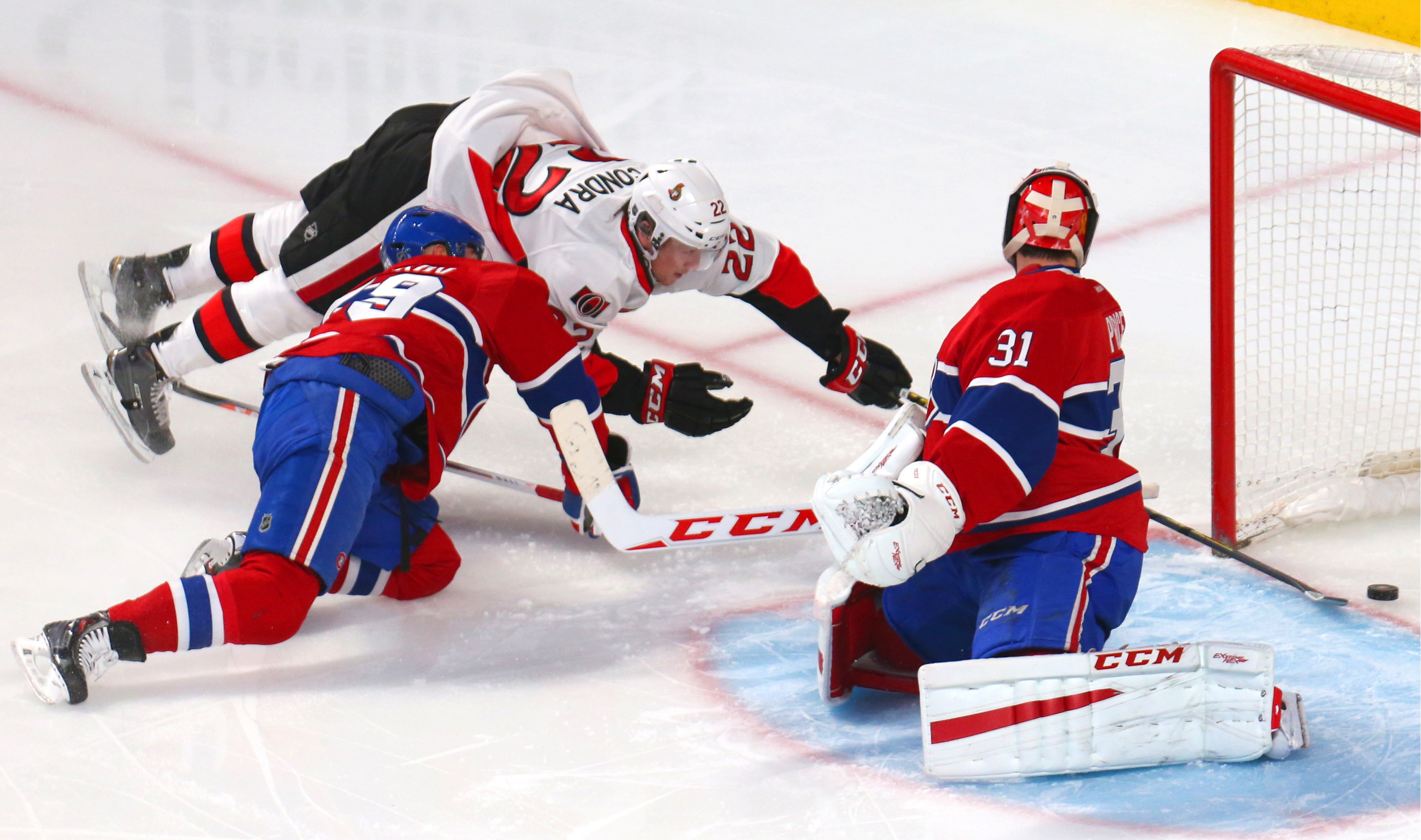 Ottawa Senators winger Erik Condra shows tremendous focus, scoring on the Montreal Canadiens while being hit by defenseman Andrei Markov.