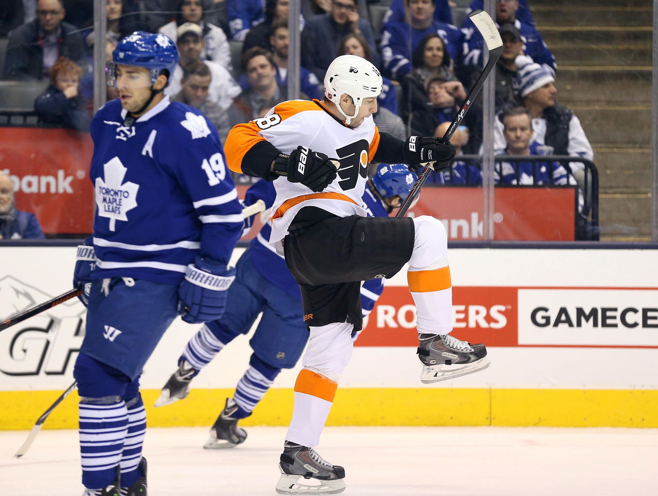 Philadelphia Flyers forward R.J. Umberger lifts a leg in celebration after his goal against the Maple Leafs in the first period.