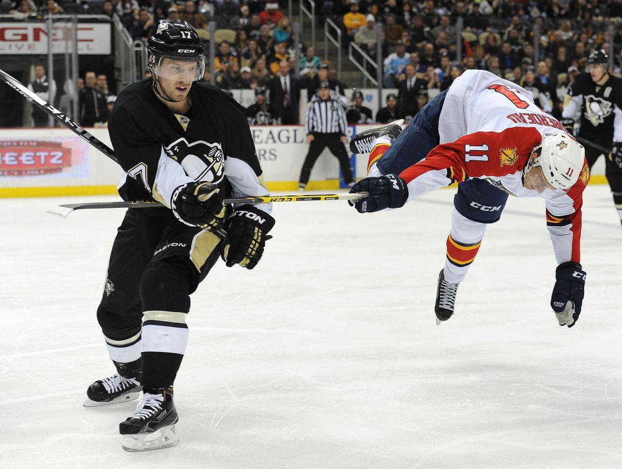 Panthers forward Jonathan Huberdeau catches some air after being hit by Penguins winger Blake Comeau.