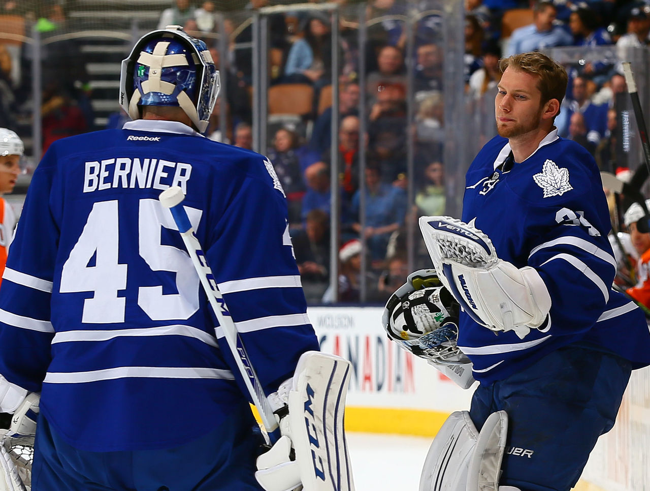 Toronto Maple Leafs goaltender James Reimer (right) relieves Jonathan Bernier, who allowed seven goals on 41 shots.