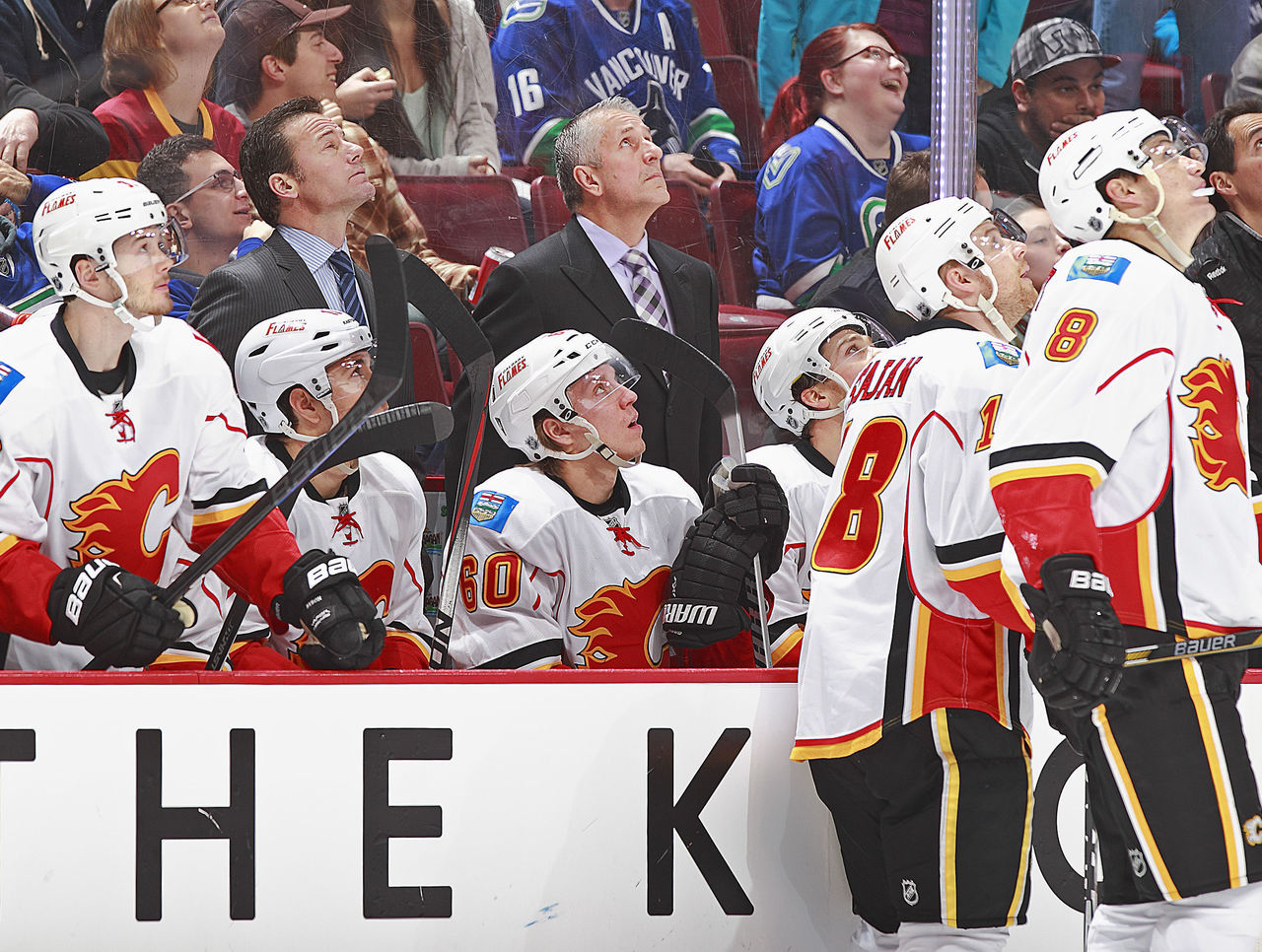 The Calgary Flames bench watches the video board at Rogers Arena after allowing the Canucks to score from 200 feet away on a delayed penalty.
