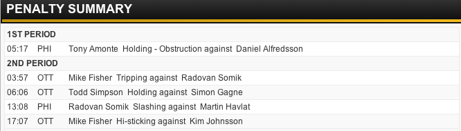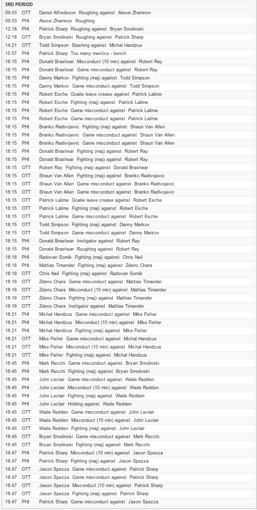 Through 40 minutes of the March 5, 2004 game between the Philadelphia Flyers and Ottawa Senators, the penalty ledger looked rather ordinary: