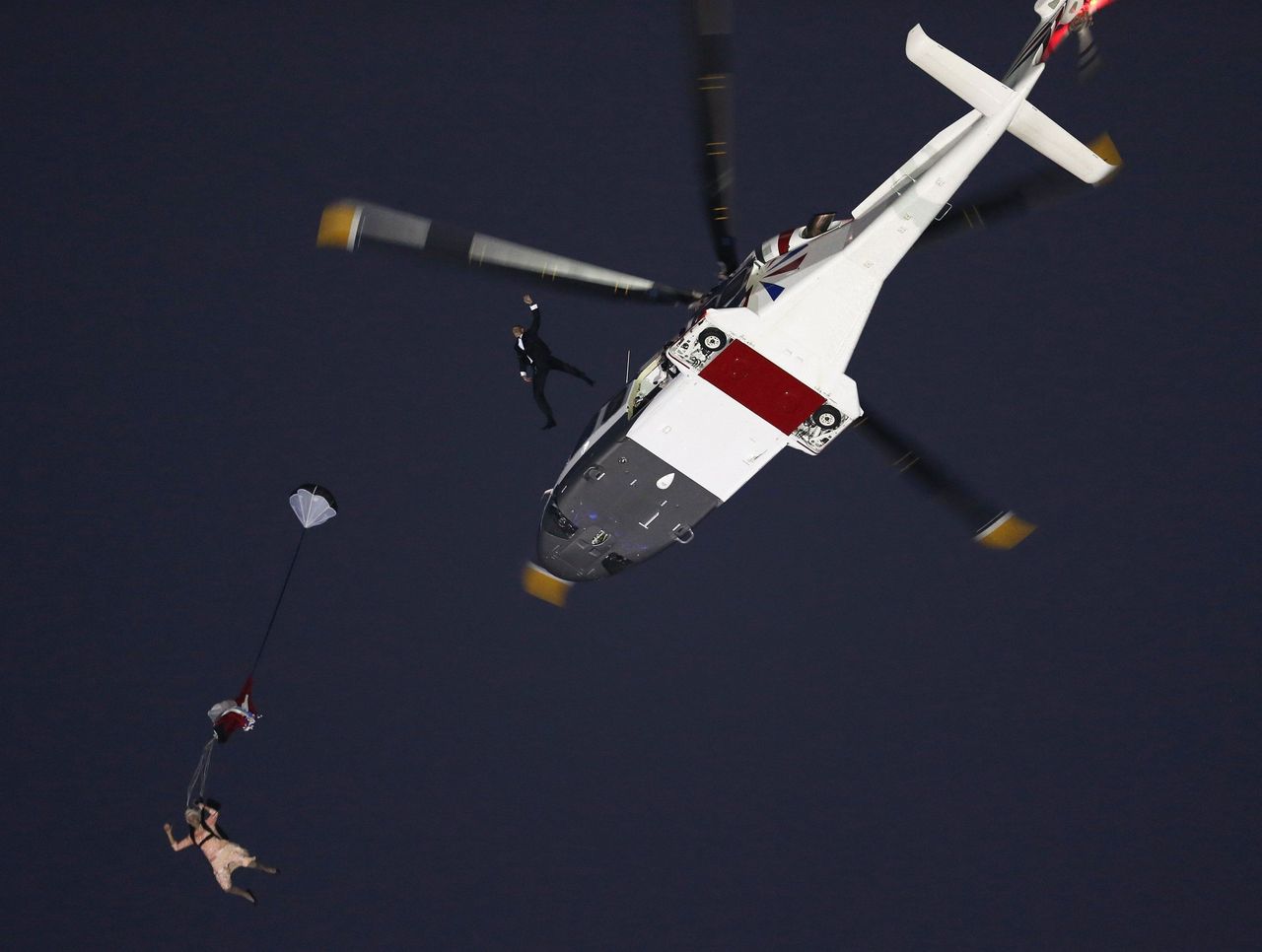 Queen Elizabeth II ''parachuted'' into the stadium with James Bond, the one that's Daniel Craig. Craig played himself after a fictional trip from Buckingham Palace to the stadium. The queen did not actually take flight, FYI.