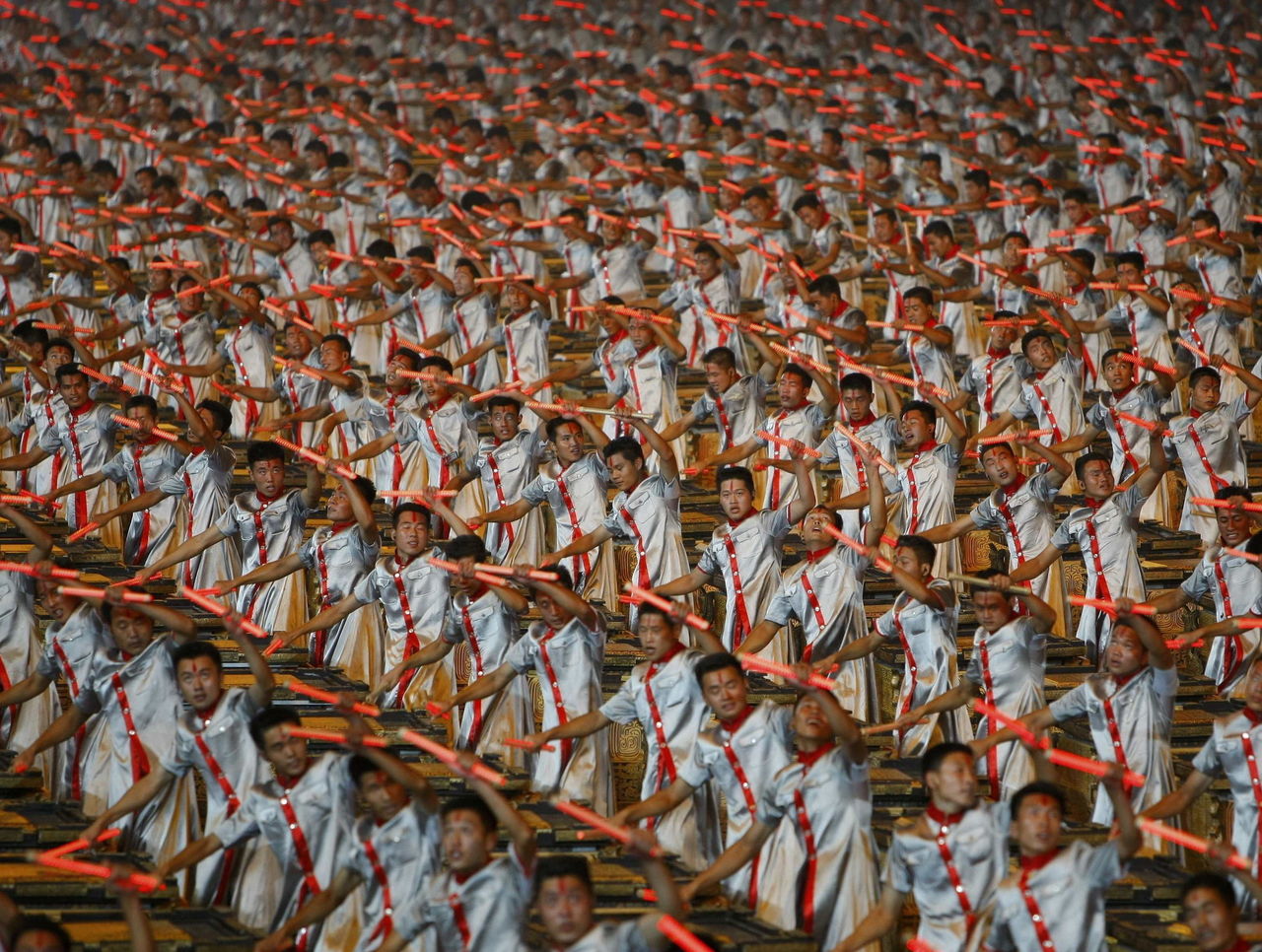 It was also the year of the stackable human. Pyramids of gymnasts and dancers constructed towers, including one with participants all in white surrounded by a circle of other participants on the ground in pink.