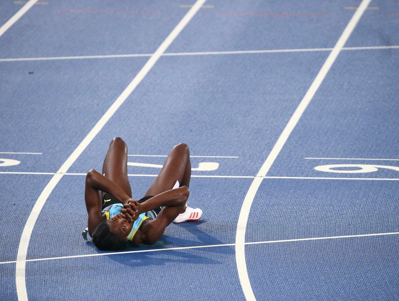 Bahamas' Shaunee Miller lies a body length past the finish line in lane seven after diving across to thwart Allyson Felix's chase in the 400m final.