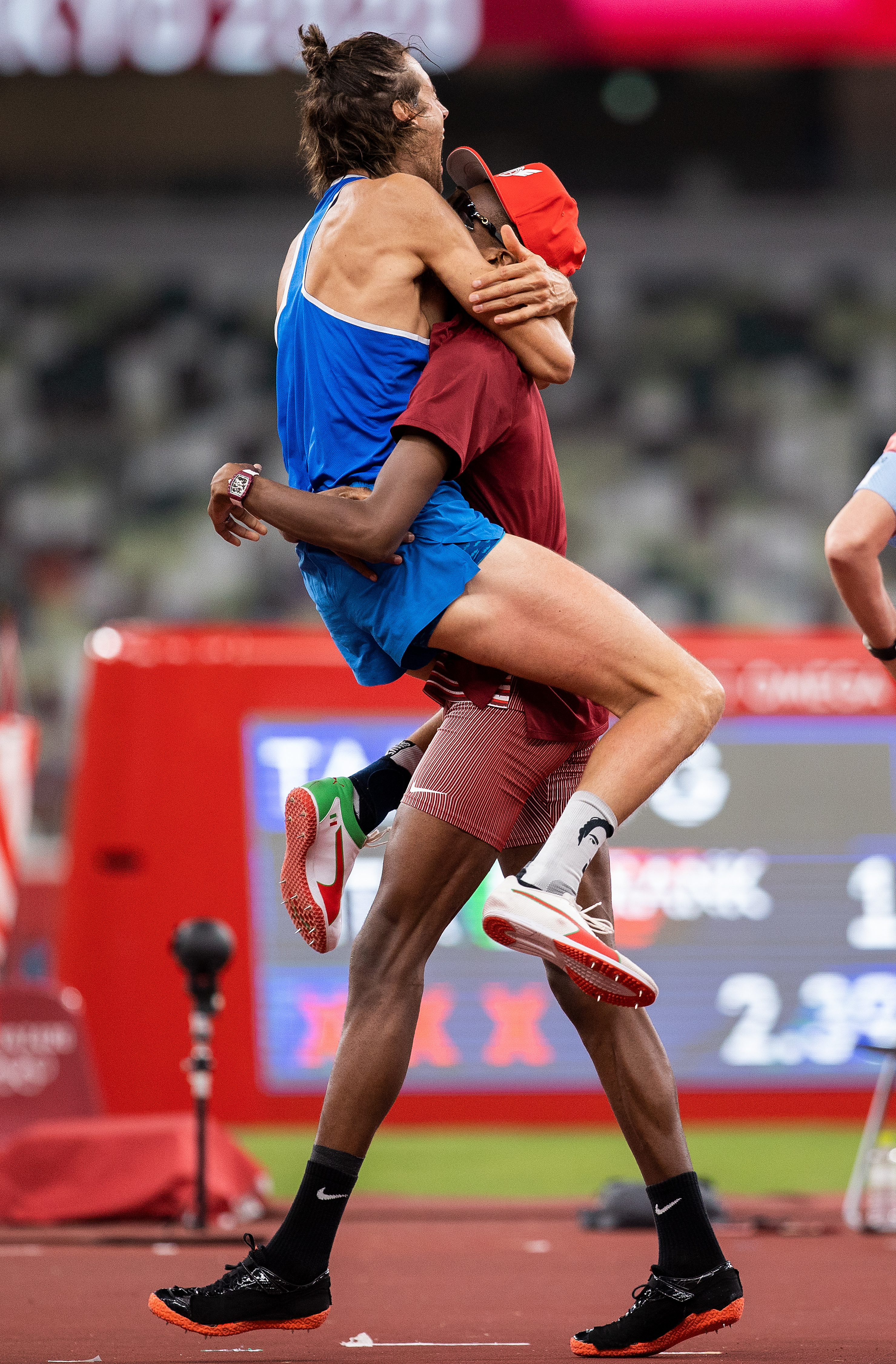 Mutaz Essa Barshim of Qatar and Gianmarco Tamberi of Italy embrace after agreeing to share the gold medal in men's high jump.