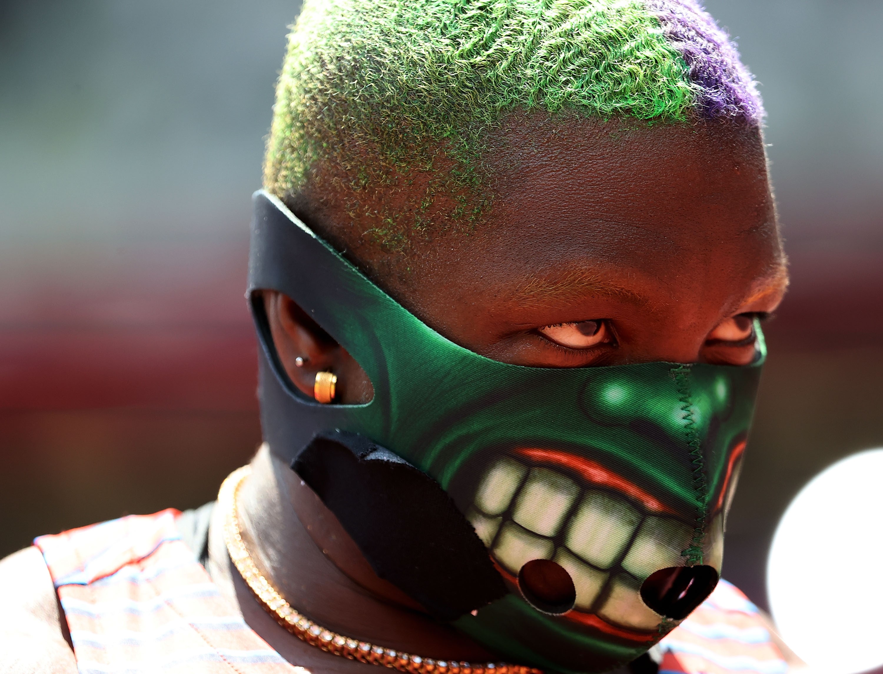 USA's Raven Saunders competes in the women's shot put final wearing a Hulk mask.