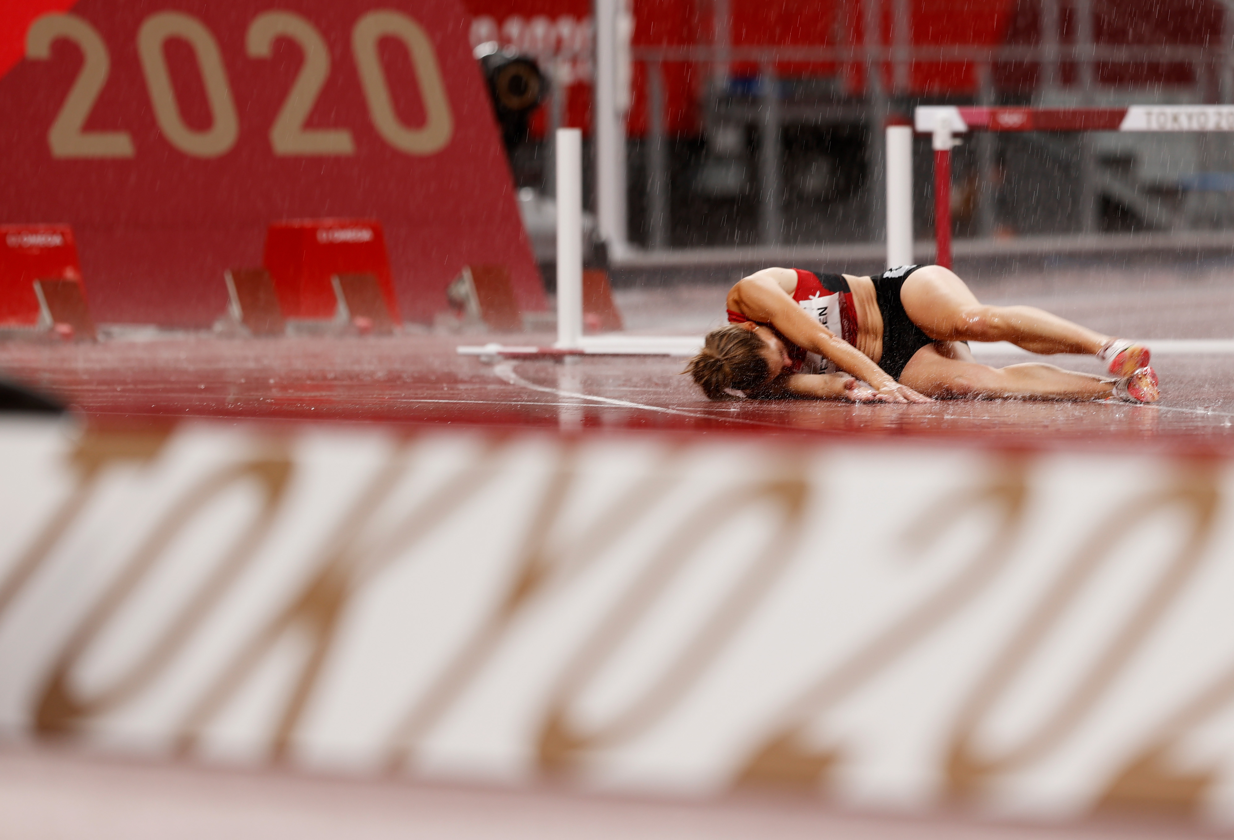 Sara Slott Petersen of Denmark reacts after competing in the women's 400m hurdles semifinals in a downpour.