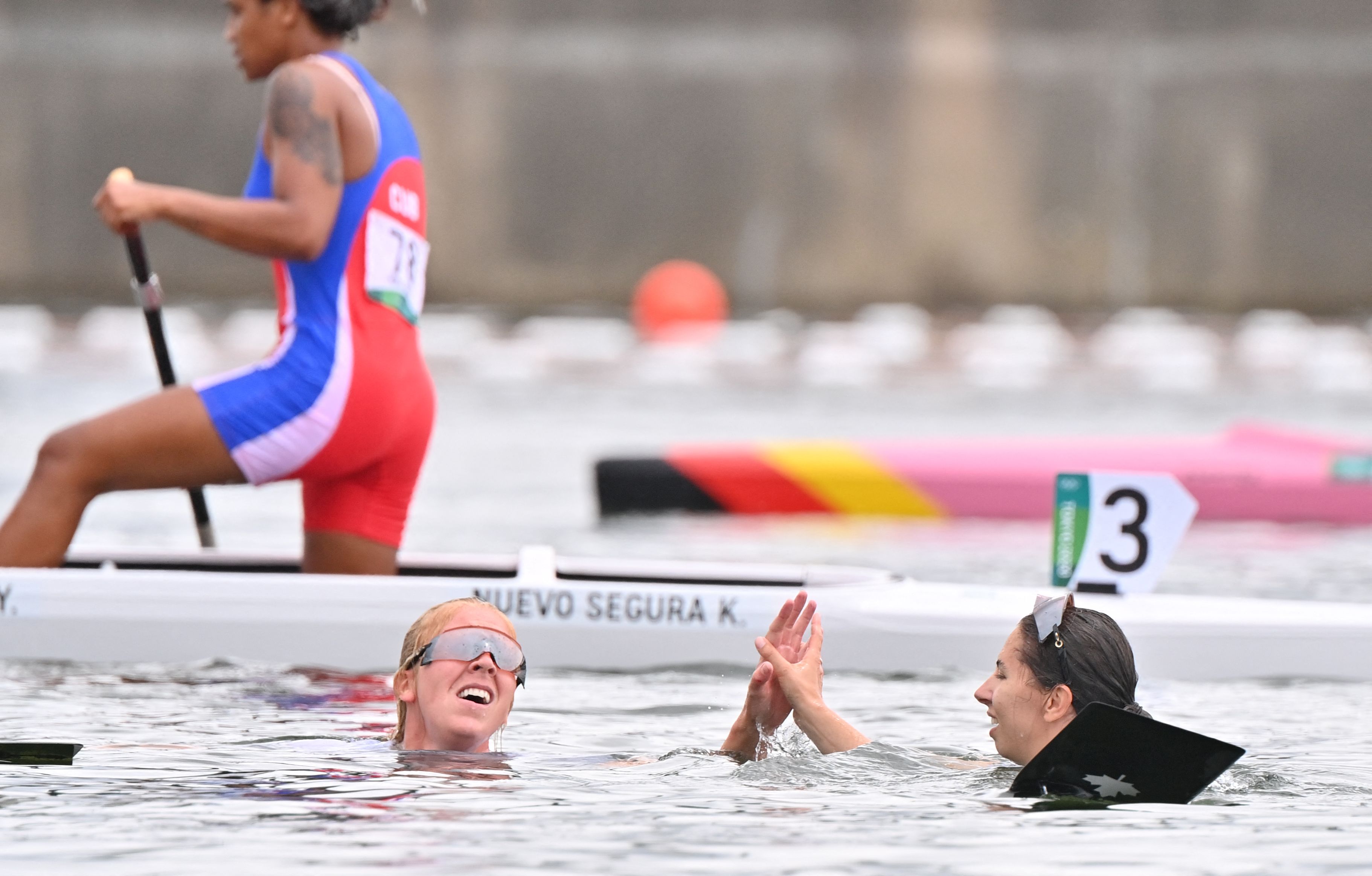 Canada's Laurence Vincent Lapointe and Katie Vincent celebrate winning bronze in the women's canoe double 500m after falling out of their boat.