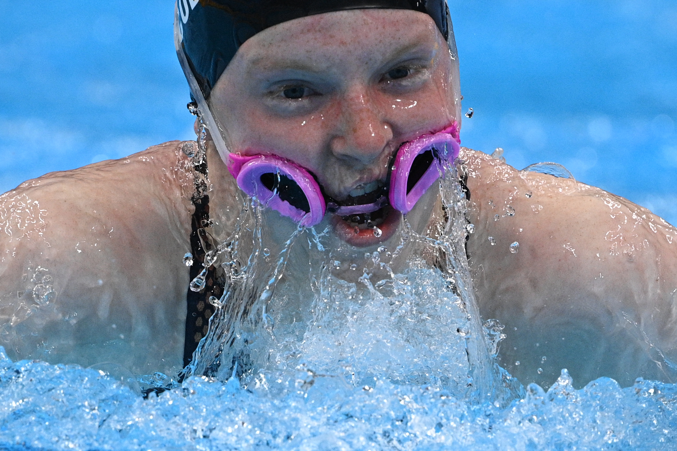 USA's Lydia Jacoby swims with her goggles around her mouth in the mixed 4x100m medley relay.