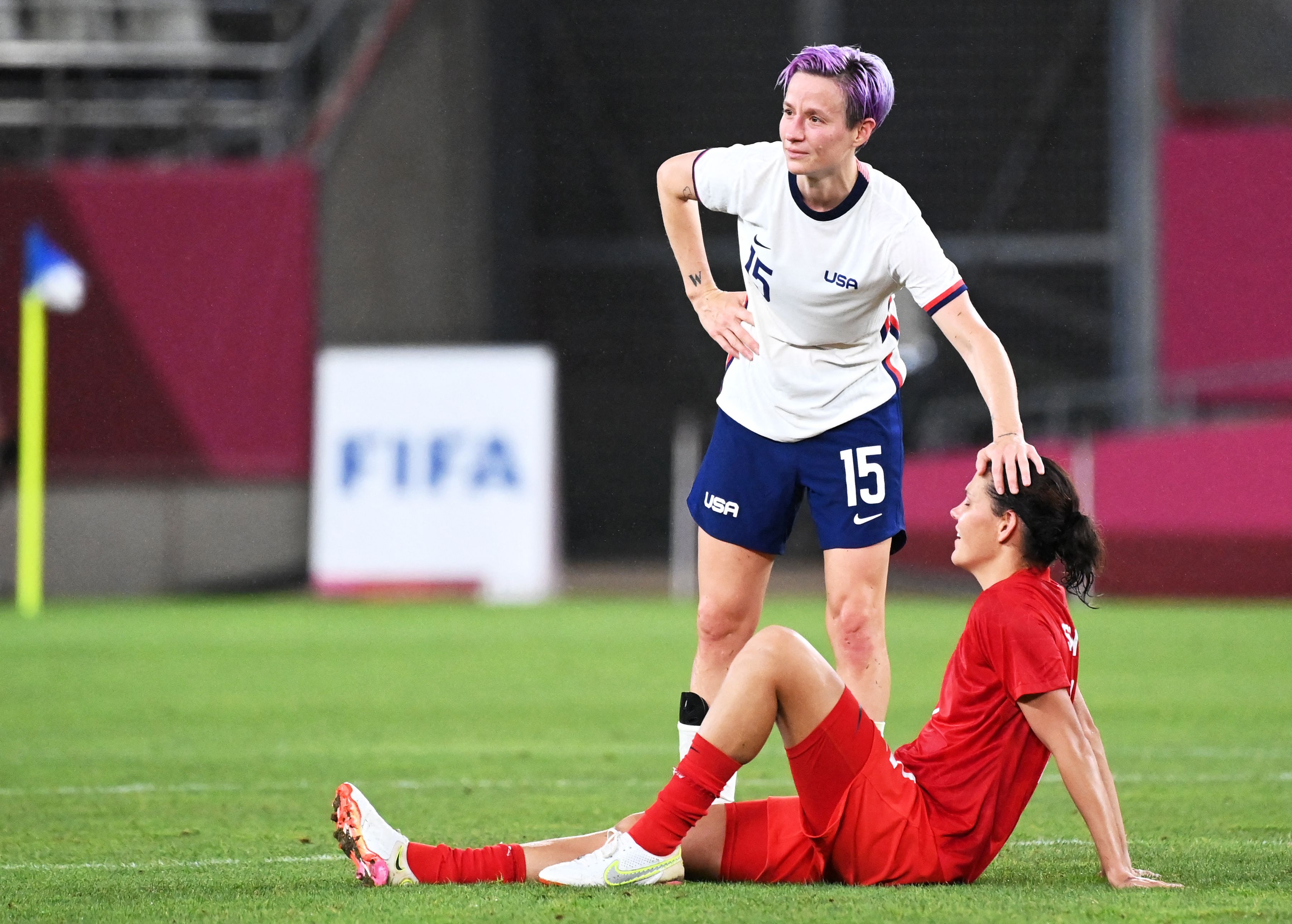 USA's Megan Rapinoe congratulates Canada's Christine Sinclair after their women's soccer semifinal match.