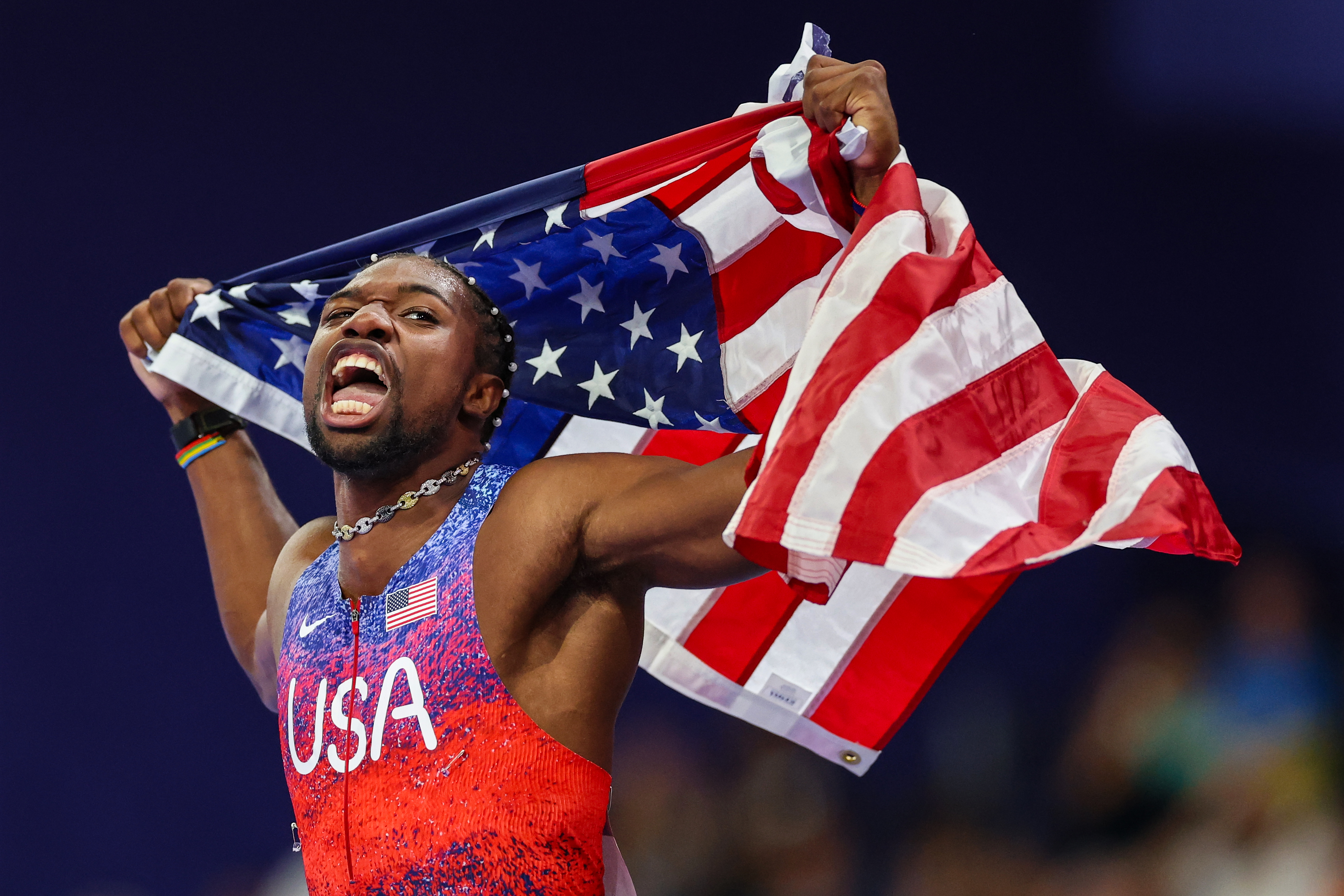 American sprinter Noah Lyles celebrates his 100m triumph at the Paris Olympics.