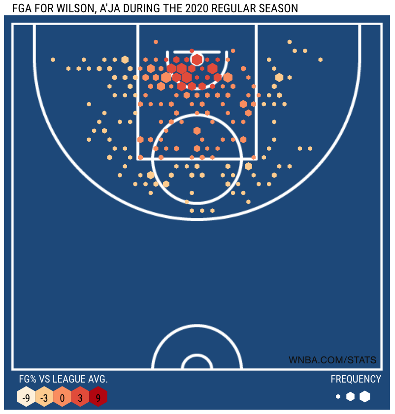 Wilson has the edge over Stewart as an interior scoring threat, though. The former connected on 72.2% of her attempts within five feet of the basket and 60.4% within eight, according to WNBA Stats. Her mid-range shooting is average but still effective out to the edge of the paint, making Wilson a deep threat by Laimbeerian standards.