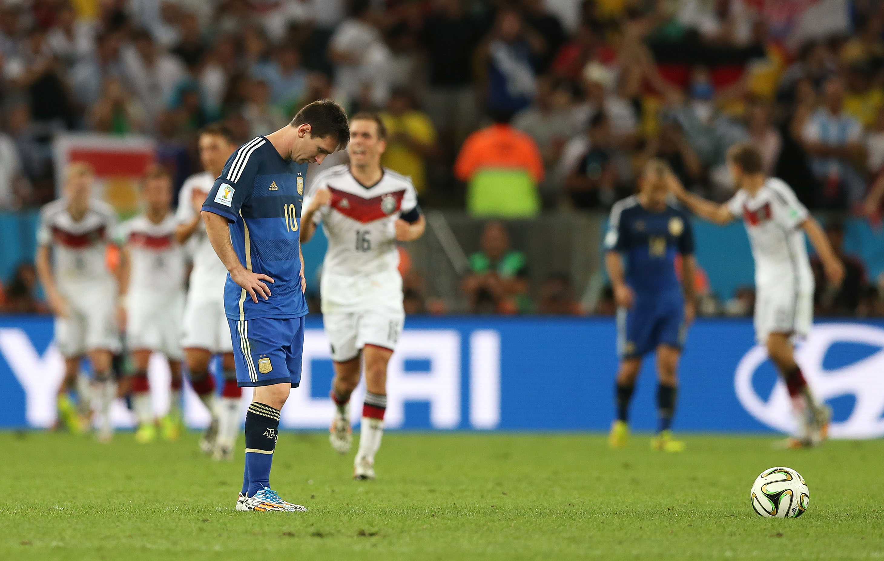 Lionel Messi processes the magnitude of Gotze's goal.