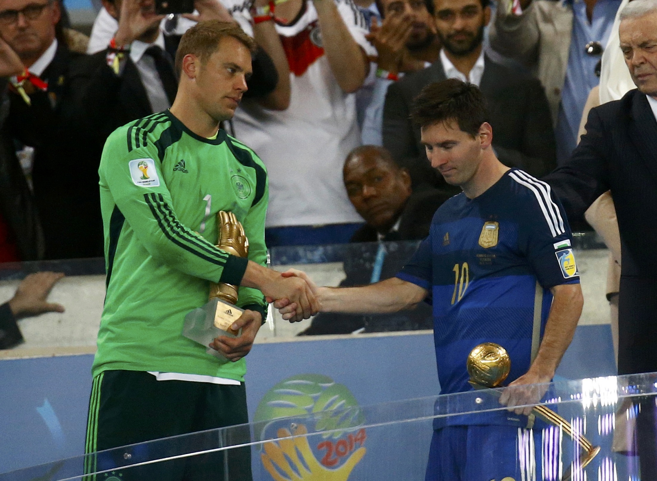 After being forced on stage to receive the Golden Ball trophy, Lionel Messi refuses to lock eyes with Golden Glove winner, Manuel Neuer.