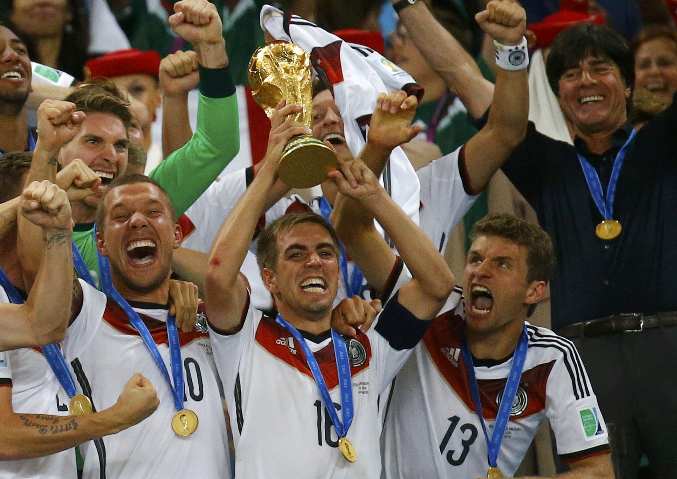 Captain Philipp Lahm is the first to lift the World Cup Trophy.