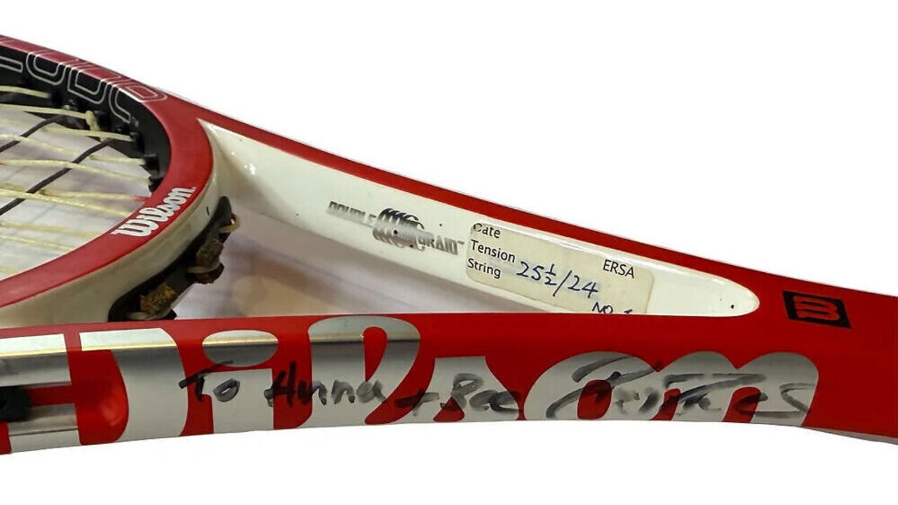 The racket, which is being sold through Prestige Memorabilia, is confirmed to be the one used by Federer to clinch the championship point against Andy Roddick and claim his second Wimbledon title. It's the first photo-matched racket from one of Federer's Grand Slam victories to ever be auctioned off, according to the auction house.