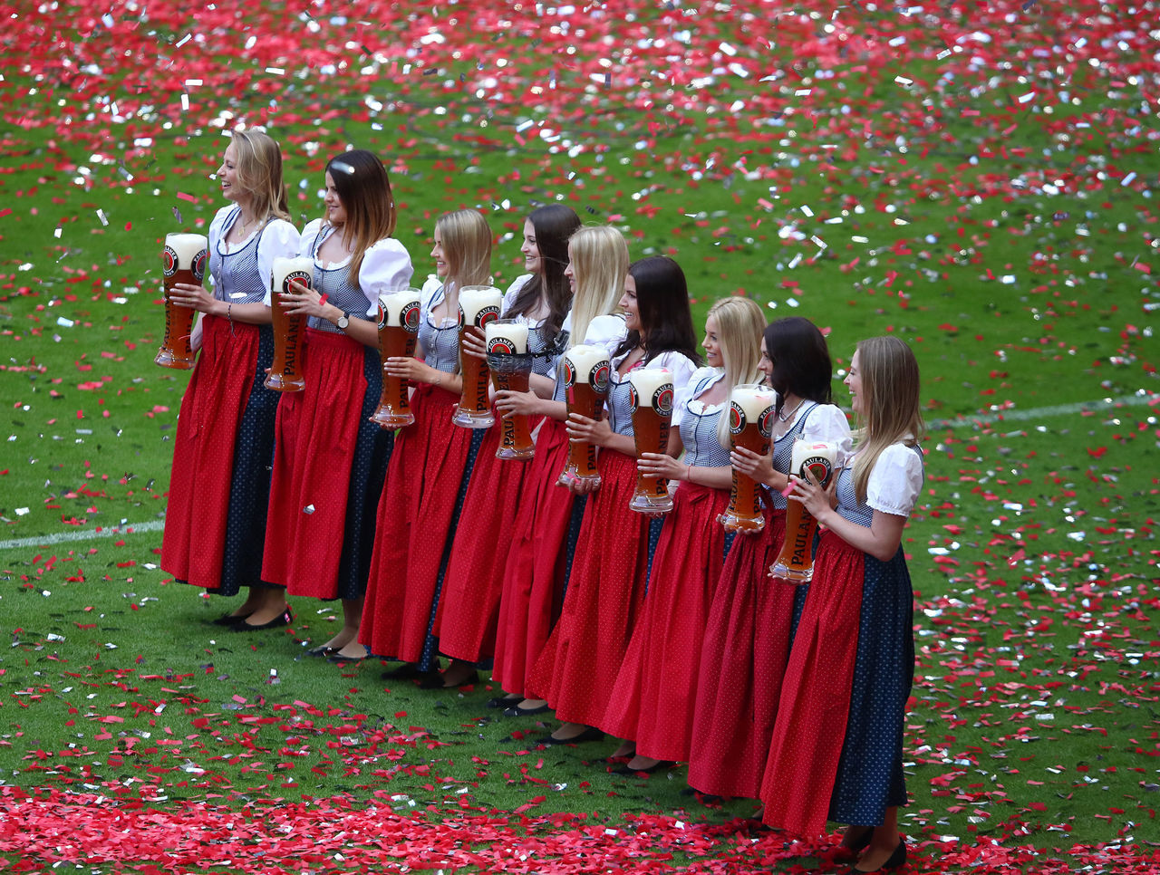 Shortly after lifting the title for the fifth straight season, a group of women in traditional German dresses entered the pitch with exceptionally large pints of beer, enabling the wild scenes that are historically associated with winning the Bundesliga.