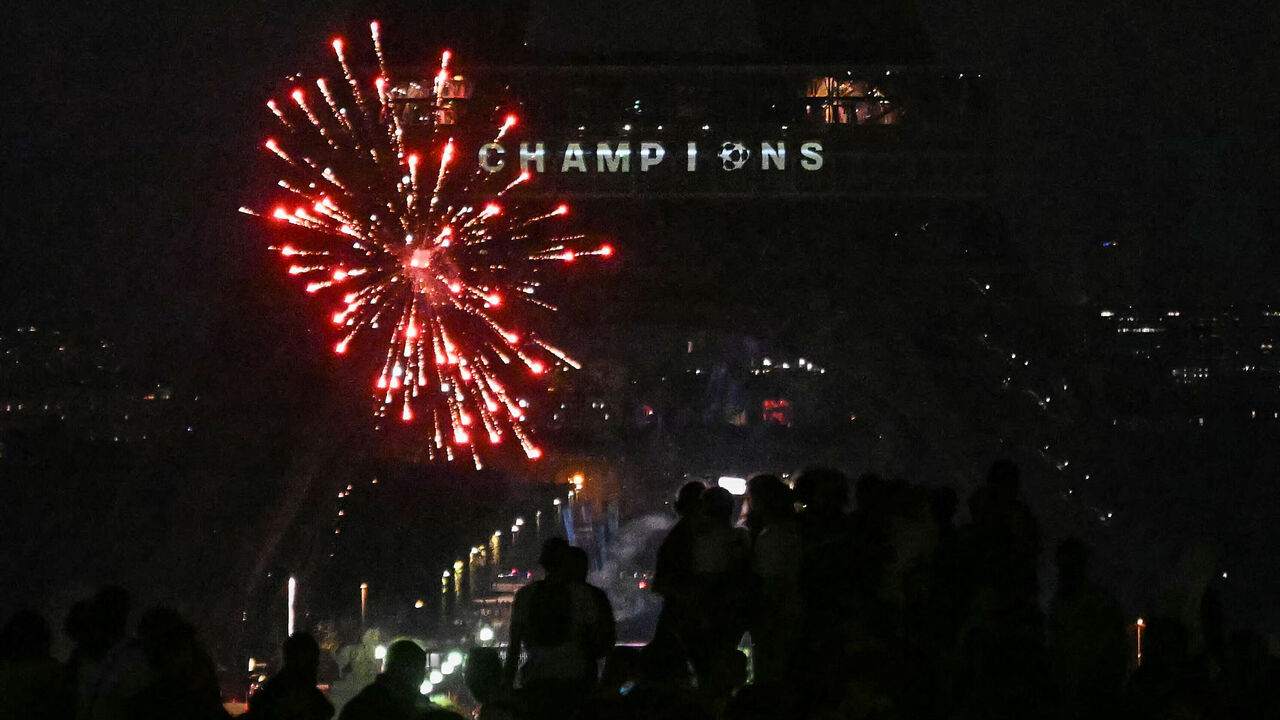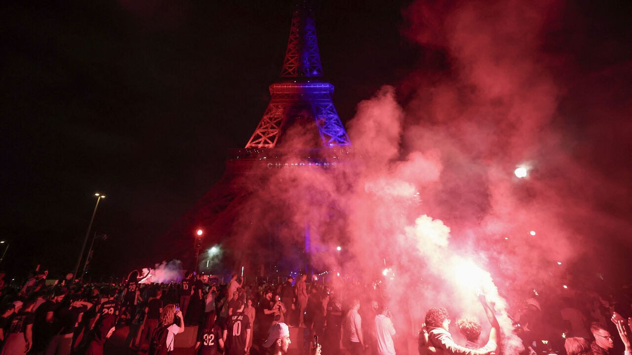 The Eiffel Tower illuminated the sky in PSG's red and blue colors as fans around the historic Parisian landmark cracked flares and fireworks to celebrate the team's historic victory.
